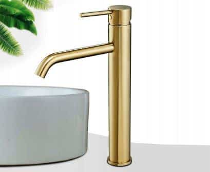 Verfijnde Elegantie met deze Smalle Verhoogde Fontein Wastafel Mengkraan in Geborsteld Goud